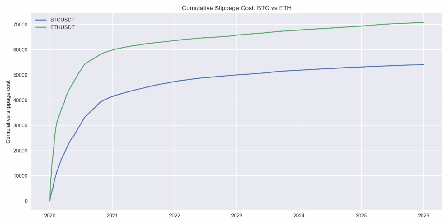 圖解:這張圖看的是絕對美元口徑下的累計滑點成本。ETH 在這次樣本中的總滑點損耗高於 BTC,說明即便不是所有時段都比 BTC 更“難做”,但從長期執行成本角度看,ETH 對流動性摩擦更敏感。