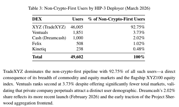 在近 5 萬名因為傳統資産才第一次進入 Hyperliquid 的用戶中,TradeXYZ 貢獻了 92.75%(46,005 人),Ventuals 3.73%(1,851 人),Dreamcash 2.02%(1,000 人),Felix 1.02%(508 人),Kinetiq 0.48%(238 人)。每個 HIP-3 Deployer 都在通過各自的前端和獲客渠道,把不同畫像的增量用戶帶進 Hyperliquid 生態。