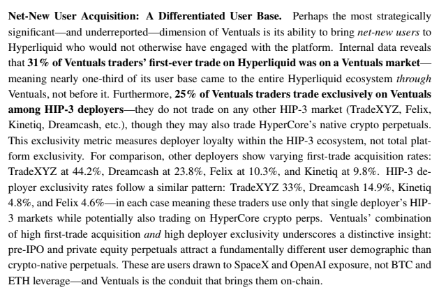 31% 的 Ventuals 用戶,第一筆鏈上交易就是在 Ventuals 市場,接近三分之一的人是因為 Pre-IPO Perp 才進入整個 Hyperliquid 生態。25% 的用戶只在 Ventuals 交易,不碰任何其他 HIP-3 Deployer。恰恰驗證了我們之前說的,RWA其實是在吸引一個獨立的用戶群。
