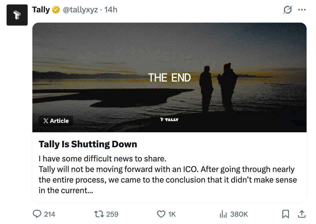 而在 Tally 發佈的公開信中,CEO Dennison Bertram 揭示了 Tally 落幕的直接原因。同時,這一原因也如同一面鏡子映照出了當前 DAO 治理領域的深層困境。(相關閱讀:2026年加密項目關停、轉型、破産名單)