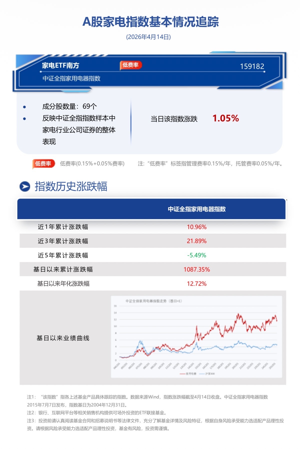 南方基金旗下家電ETF南方(159182)正在發售中!截至2026年4月14日收盤,家電ETF南方(159182) 跟蹤標的指數中證全指家用電器指數(930697.CSI) 漲1.05%。