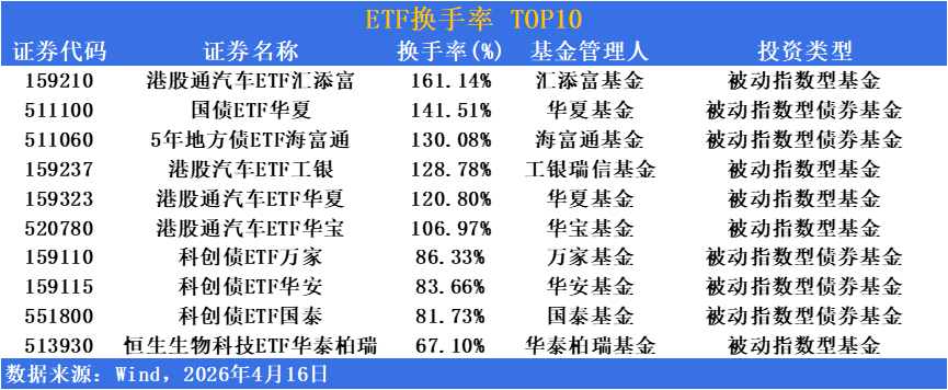活躍度方面,短融ETF成交超424億位居榜首,港股通汽車ETF換手率超161%高居榜首