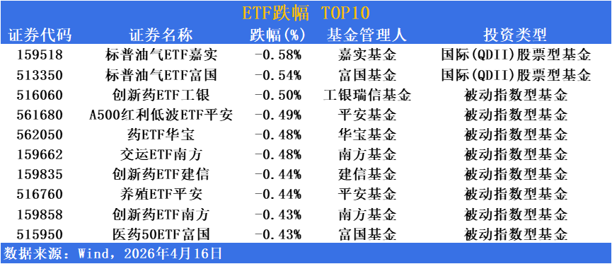 美伊談判進展推動地緣政治緊張局勢階段性緩和,國際油價自高位小幅回落,油氣板塊出現獲利了結壓力。油氣主題ETF以約0.5%的跌幅居前,顯示市場對能源股短期估值修復後的正常回調預期,跨境油氣産品同步微調。