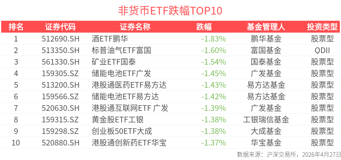 截至今日收盤,全市場共計679只非貨ETF下跌,下跌比例達46%。寬指方面,創業板50指數今天表現靠後,下跌0.81%;行業主題指數方面,中證酒指數、國證新能源電池指數跌幅居前,分別下跌1.86%、1.50%。