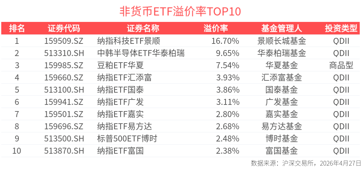 截至今日收盤,納斯達克科技市值加權指數溢價居前,納指科技ETF景順收盤溢價16.70%;中證韓交所中韓半導體指數情緒高漲,中韓半導體ETF華泰柏瑞收盤溢價9.65%。