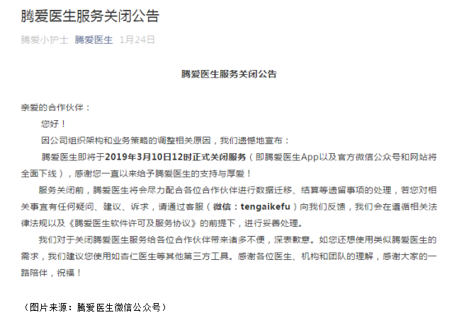 而关于下线原因,腾爱医生微信公众号解释称,因公司组织构架和业务策略调整。