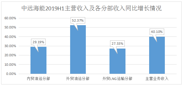 而从各业务分部的营收同比增长率来看,如上图所示,其中外贸油运分部的同比增长为52.37%,是期内营收增长最快的业务分部。我们可以看出,国际油运市场近期发展较快。业内专家分析,目前国际油运市场处于上行周期、而且已经较以往提前进入旺季行情,2019年下半年可能还好于上半年。