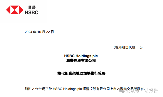 10月22日,汇丰控股(00005.HK)公告正式宣布:正简化组织架构为四大业务,以加快推行其优先策略,2025年1月1日起正式施行。
