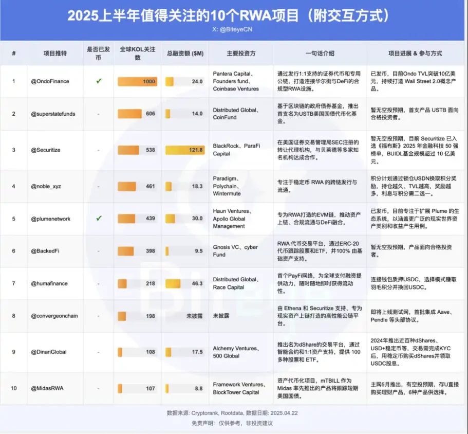 项目进展&参与方式:自 2017 年成立以来,已获 SEC 注册、发行全球首批信用评级和指数型代币化证券,并与 BlackRock、Apollo 等机构合作。BlackRock 于 2024 年 3 月推出了 BUIDL 基金,2025 年 BUIDL 基金规模突破 10 亿美元,并获 CNMV 投资公司牌照,持续拓展欧美市场。暂无空投预期,通过 KYC 后可以在平台进行投资,但是审核以及投资标准比一般币圈项目要严格。