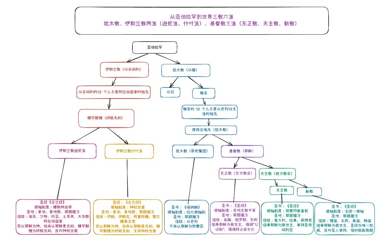 这块儿我们得从亚伯拉罕衍生出来的三教六派来分析。包括:犹太教、伊斯兰教(逊尼派、什叶派)、基督教三派(东正教、天主教、新教)。