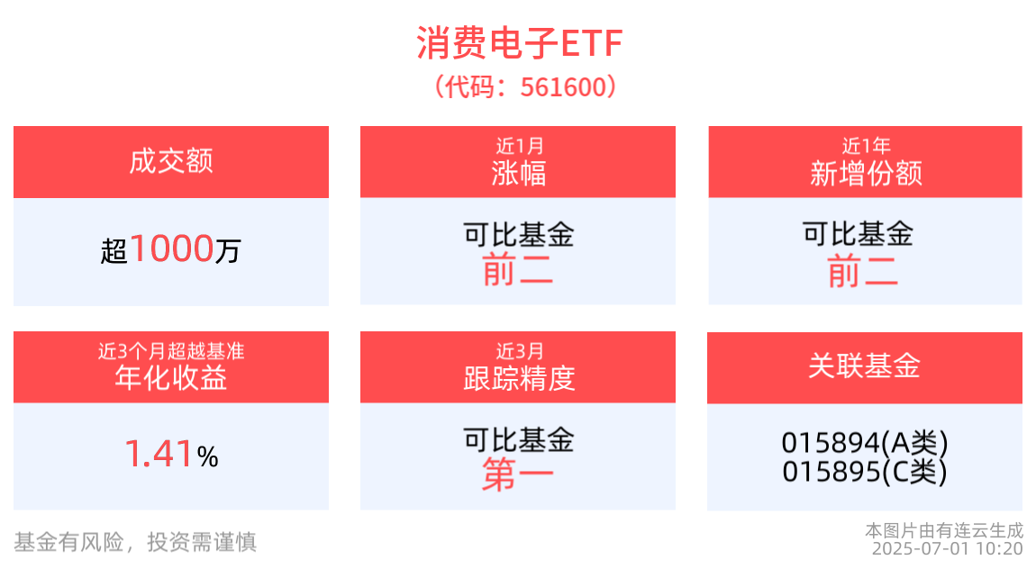 流动性方面,消费电子ETF盘中换手7.04%,成交1155.39万元。拉长时间看,截至6月30日,消费电子ETF近1年日均成交1507.14万元,排名可比基金前2。截至6月30日,消费电子ETF近1年净值上涨21.57%。