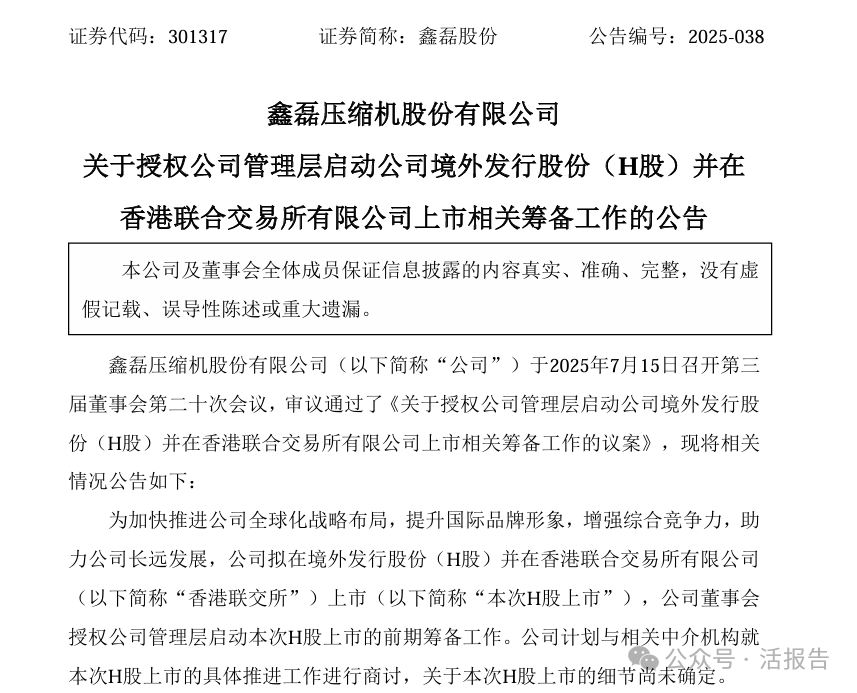 7月15日晚間,來自浙江的專業從事空氣壓縮機研發、製造、銷售、服務的空壓機製造商鑫磊股份(301317.SZ)發佈公告稱,為加快推進公司全球化戰略佈局,提升國際品牌形象,增強綜合競爭力,助力公司長遠發展,公司擬發行H股股票並在港交所上市。