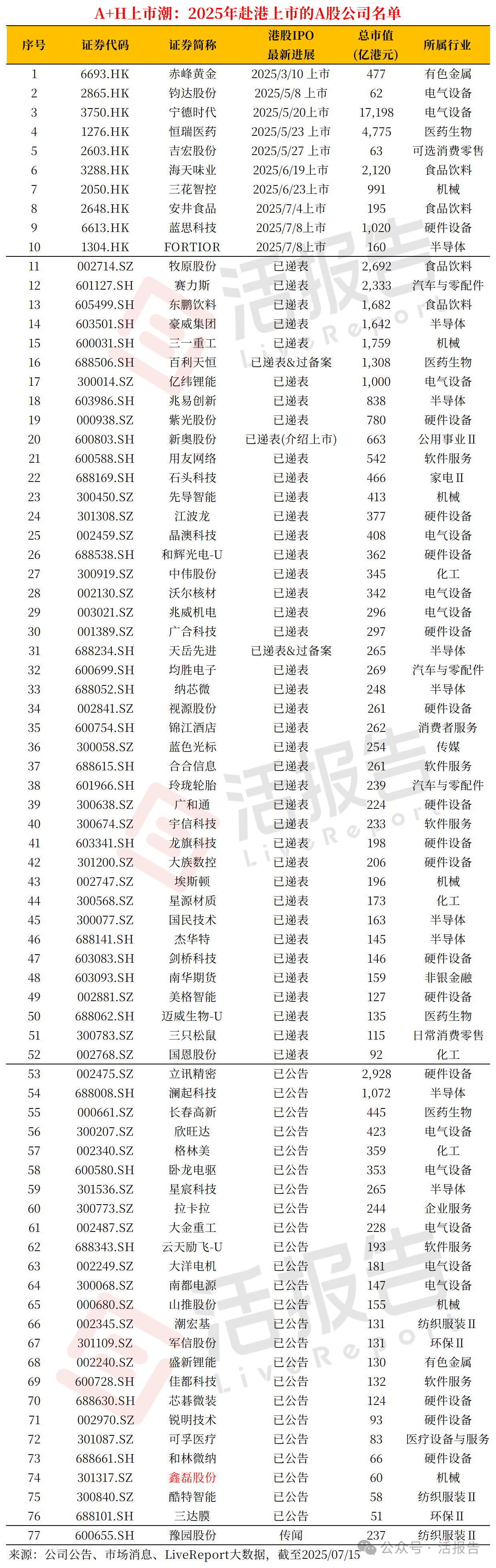 據LiveReport大數據統計,截至7月15日,今年已有赤峰黃金(6693.HK)、鈞達股份(2865.HK)、寧德時代(3750.HK)、恒瑞醫藥(1276.HK)、吉宏股份(2603.HK)、海天味業(3288.HK)、三花智控(2050.HK)、安井食品(2648.HK)、藍思科技(6613.HK)及FORTIOR(1304.HK)登陸港交所,實現AH上市;此外,還有67家公司擬「A+H」上市,其中42家已遞表,24家已發公告,1家傳聞上市,AH上市浪潮勢不可擋。