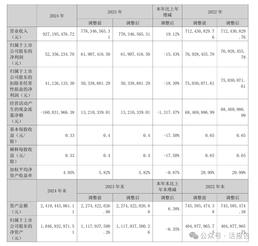 該財務報表顯示,2024年公司營業收入同比增長19.12%至9.27億元,但盈利能力稍有下滑:歸母淨利潤下降15.43%至5235萬元,尤其值得注意的是經營活動現金流由正轉負,顯示營收增長可能存在資金週轉問題。資產總額增長6.38%的同時,淨資產反而縮水6.35%,結合加權ROE從5.82%降至4.95%,反映出公司資產擴張未能帶來效益提升,整體呈現"增收不增利"的運營困境。