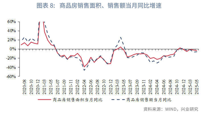 在不动产方面,商品房销售有所走弱。4-5月商品房销售面积当月同比跌幅连续走阔,商品房销售走弱表明楼市复苏进程仍有波折。