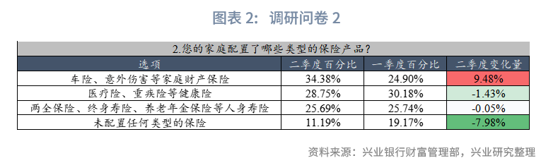 保险需求方面,客户配置最多的险种为“车险、意外伤害等家庭财产保险”,占比为34.38%,较上季度大幅提升;健康险和人寿险的配置比例分别为28.75%、25.69%;另有11.19%的客户并未配置任何类型的保险。