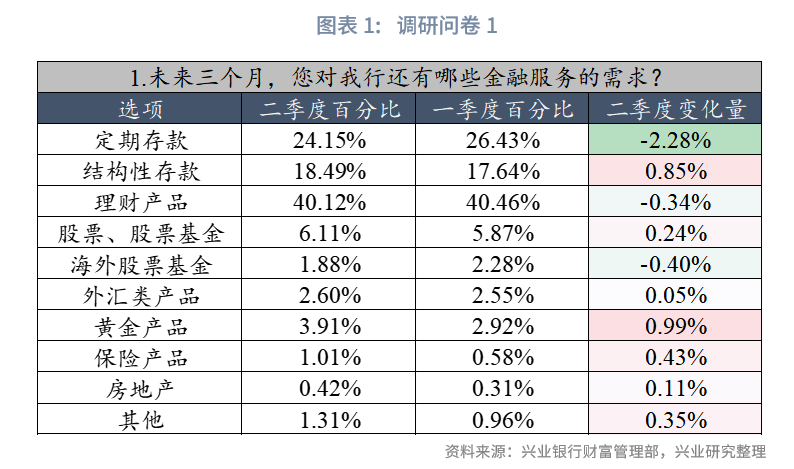 我们分别从资产需求、收益和预期以及投资习惯三个角度设置了八个问题,通过兴业银行手机银行APP对我行双金客户的观点进行收集和调研,以获取客户群体对财富资产配置的观点。2025年第二季度调研情况如下: