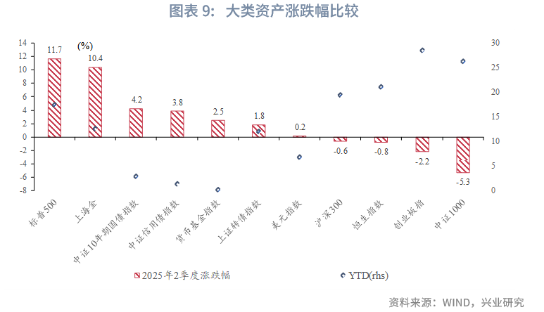 ●配置实况:存款方面,第二季度居民定期存款占比进一步上行。理财方面,固定收益类占比上升,现金管理类占比回落。基金方面,第一季度股票类基金发行量回升,股票市场季度交易量较上季度继续下滑。不动产方面,4-5月商品房销售跌幅有所走阔。