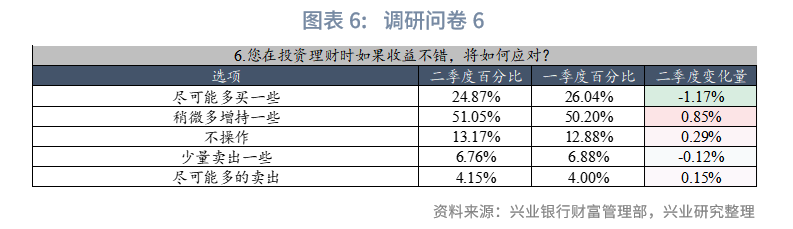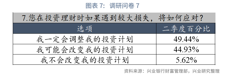 在投资收益较好时,调研显示客户多数会选择增持,对产品增持的客户比例达到75.92%,较上季度有所下降;有止盈操作的客户为10.91%。当投资面临较大亏损时,坚决止损的客户比例为49.44%,能够坚定持有的客户比例仅占5.62%。