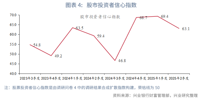 ●调研结果:资产需求方面,第二季度存款类低波动资产需求有所回落,股票、外汇、黄金产品需求上升,客户风险偏好提升。预期方面,股市预期有所回落,股票投资者信心指数下降至63.1%。投资习惯方面,在收益较好时,客户的增持意愿小幅下降;理财的期限偏好略有延长。