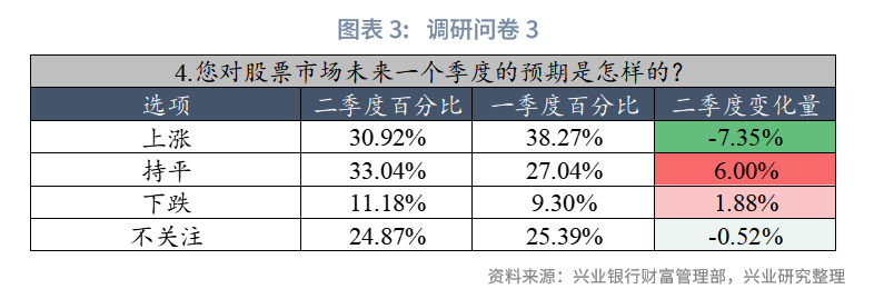在股票市场预期方面,在第二季度上证指数先抑后扬的背景下,客户对股票市场未来一个季度的预期整体倾向于中性。看涨的客户占比较上季度减少了7.35%;观点持平的客户占比较上季度增加6.00%;看跌的客户占比增加1.88%;对股票市场不关注的客户比例减少了0.52%。市场情绪较上季度略有降温。第二季度股票投资者信心指数为63.1%,较上季度回落6.3个百分点。