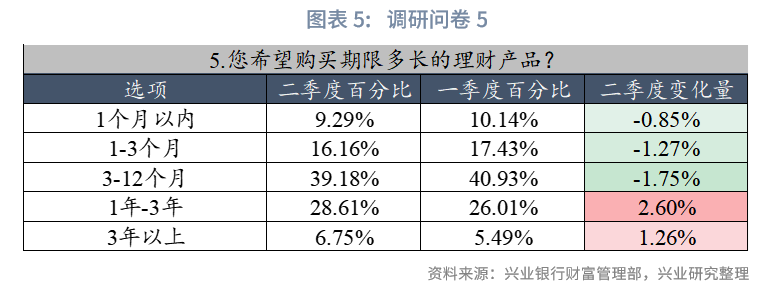 在持有期限方面,客户理财的期限偏好略有延长。产品持有期不超过3个月的客户占比为25.45%,较上季度降低了2.12%。多数客户理财产品持有期为3-12个月,占比为39.18%,较上季度下降了1.75%。有6.75%的客户理财产品持有期限预期超过3年,较上季度提升了1.26%。
