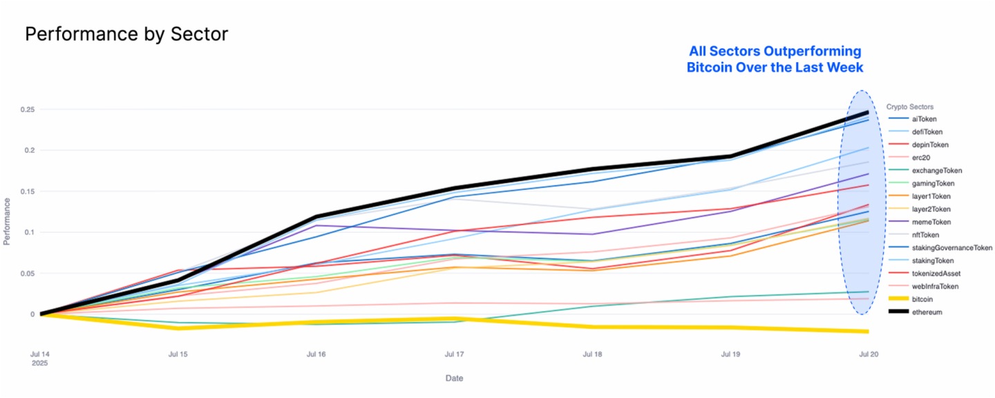 - 過去一周,所有山寨幣板塊的表現均優於比特幣,其中以太坊的表現尤為突出。這使得山寨幣市值在過去兩周内增長了 2160 億美元。