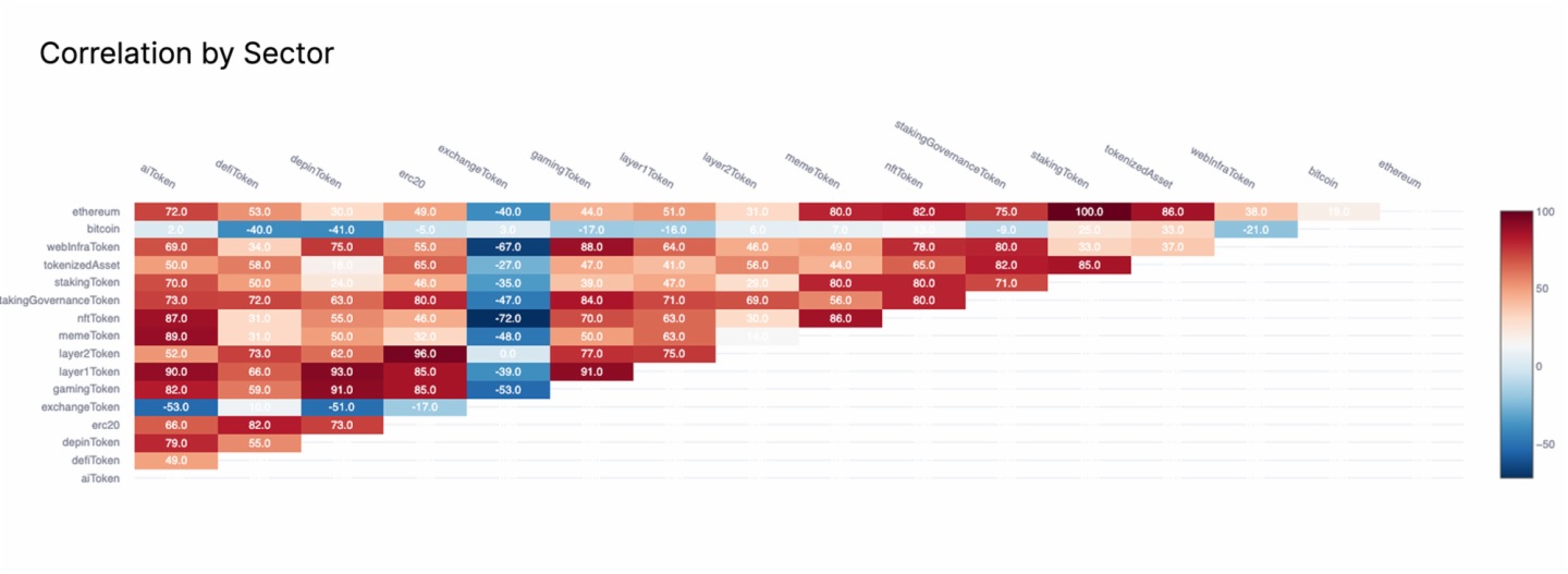 從板塊相關性的角度看,這一趨勢進一步得到強化。幾乎所有山寨幣板塊目前均已呈現高度同步波動,反映出市場整體無差別的普漲,且基本不受任何特定資産基本面的影響。 與此同時,山寨幣板塊與比特幣的相關性顯著下降,凸顯其價格行為的日益分化,並證實了比特幣與更廣泛的山寨幣生態係統之間近期價格走勢呈正交性關係。