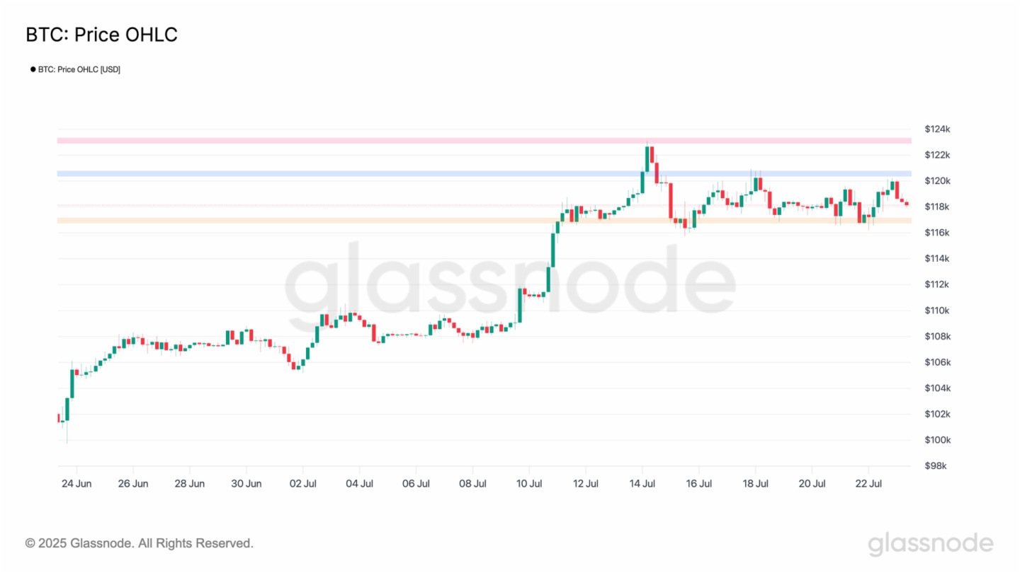 7 月對比特幣而言是爆炸性增長的一個月,價格從周内低點的 105400 美元飙升至創歷史新高的 122700 美元,波動性顯著上升。但臨近周末時,短期動能有所減弱,此後比特幣價格便一直在其歷史高點下方,呈現出震蕩整理態勢。