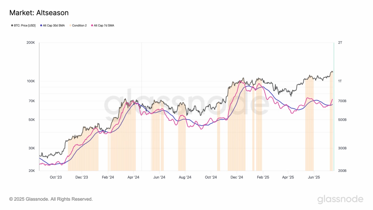 該框架旨在捕捉風險曲綫上的資本輪動動態。當比特幣與以太坊吸引資本流入,同時穩定幣流動性增長時,資本向高風險山寨幣輪動的條件將變得更加成熟。若這種環境與山寨幣總市值之間出現動量交叉,則表明資金正積極流入山寨幣領域,並推動其估值擴張。 根據該指標可以發現,「山寨季」條件最早於 7 月 9 日出現,並延續至今,這表明整個加密貨幣領域正在持續進行資本的重新分配。