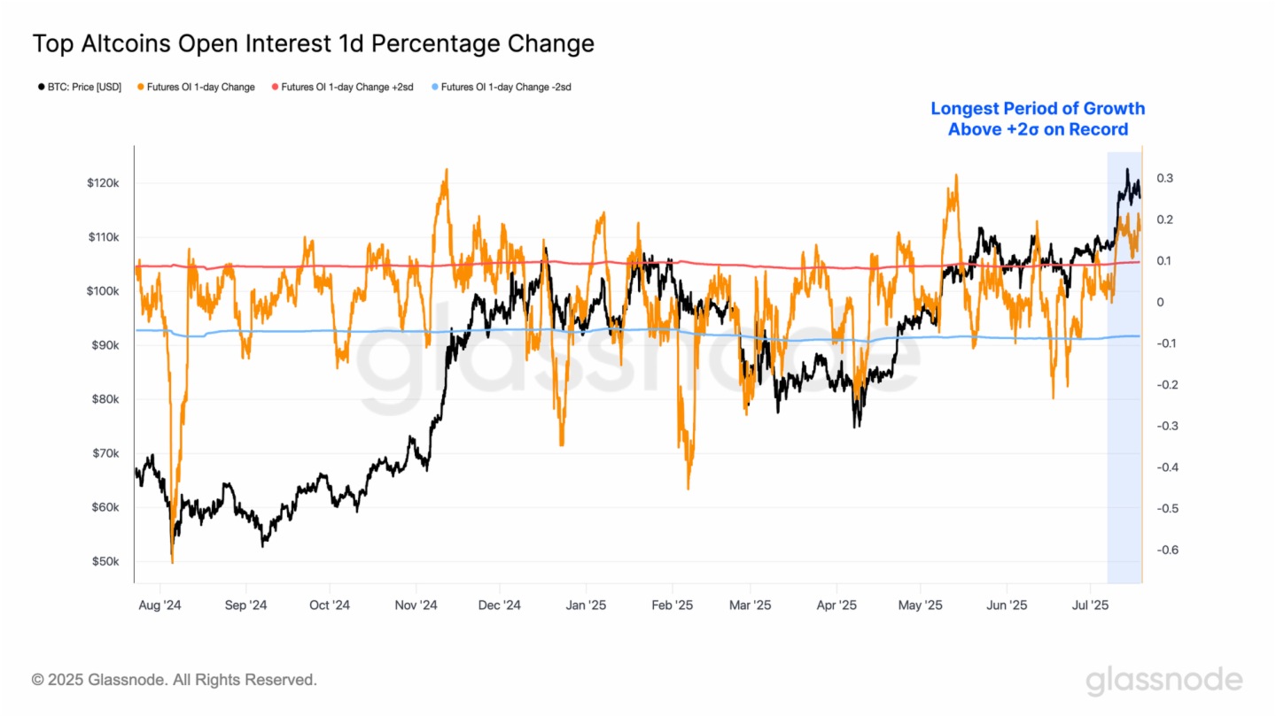 在評估總未平倉合約的增長幅度時,Glassnode 發現,最近 12 個交易日的日均增幅持續高於 + 2 標準差阈值,創下有記錄以來最長的持續時間。 這不僅強調了近期未平倉合約擴張的顯著規模,也突顯了其持續性,可能預示著市場參與者的投機行為發生了重大轉變。