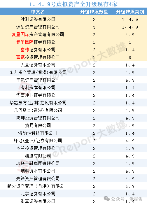 复星一直在布局虚拟资产领域。据香港证监会,复星国际资产管理公司已经申请4、9号牌升级,复星国际证券有限公司申请1号牌升级,目前1、4、9号牌虚拟资产服务全面升级的公司仅4家,包括胜利证券、源创资产管理有限公司、复星国际和富德。