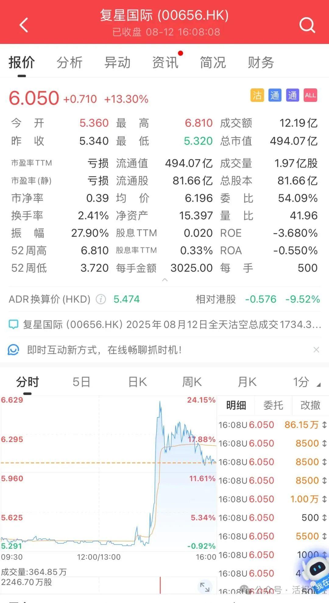 消息一出,复星国际(0656.HK)股价一度飙升超20%,截至8月12日收盘,复星国际收涨13.3%。