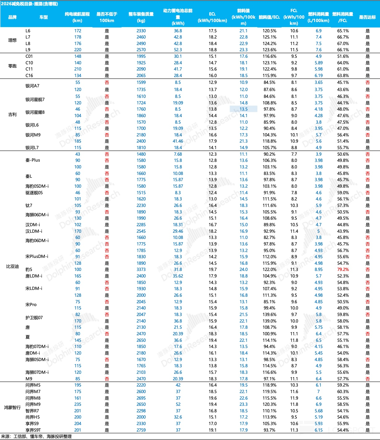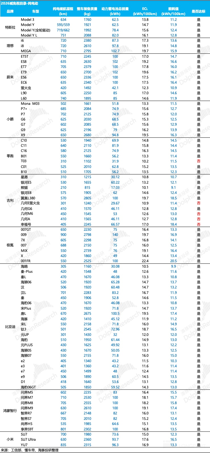 為了更直觀地評估新政策的實際影響,海豚君對已覆蓋的多家新能源車企在産在售的純電車型(若存在新舊款同時銷售的情況,選取新款車型)進行了逐一測算,並整理出能夠進入 2026 年及以後生效的《減免稅目錄》的車型名單。