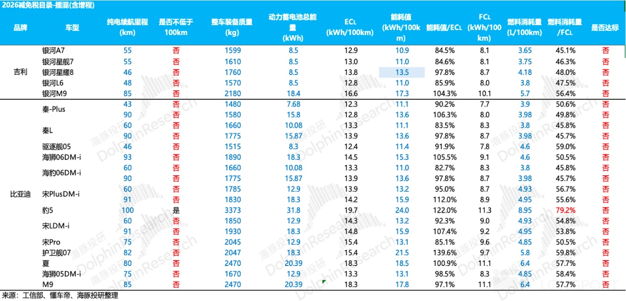 為整理出能夠進入 2026 年及以後生效的《減免稅目錄》的車型名單。海豚君對已覆蓋車企的在售 PHEV 車型(共 40 餘款)進行達標測算,發現從單個車企維度的影響: