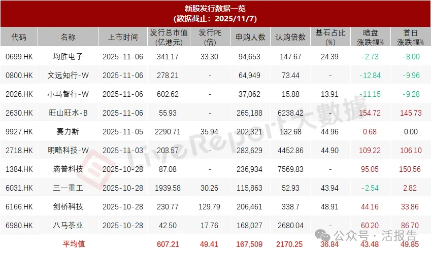 最近一周,7家公司招股,其中旺山旺水-B、均胜电子、小马智行-W、文远知行-W于11月3日结束招股后已经成功上市。