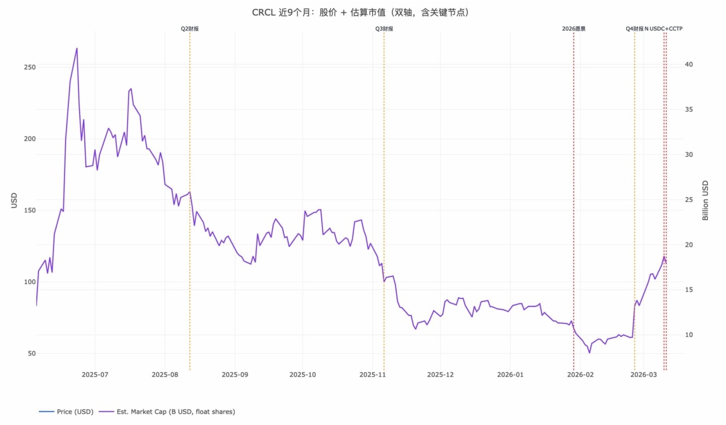 第二,Circle 的戰略敘事正在發生變化。公司越來越少強調「穩定幣發行」,而更多地強調:全球支付網絡,開發者 API,穩定幣結算基礎設施。換句話說,Circle 正試圖把 USDC 從一個産品,變成一個網絡。也正是在這一敘事逐漸被市場理解之後,Circle 的股價開始出現新的上行空間。