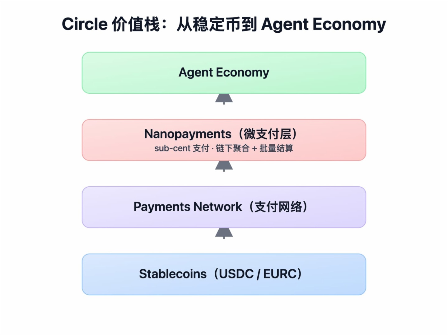 最底層是穩定幣本身,例如 USDC,它提供的是一種 鏈上的美元資産。在這一層之上,Circle 正在建設支付網絡,例如 Circle Payments Network,讓穩定幣能夠用於跨境結算和資金流動。再往上一層,則是開發者基礎設施,包括 API、錢包能力以及跨鏈工具,讓互聯網産品能夠更容易地接入穩定幣係統。而最近推出的 Nanopayments,則開始觸及一個新的問題:如果未來經濟活動中出現大量 AI Agent,它們之間如何完成支付?
