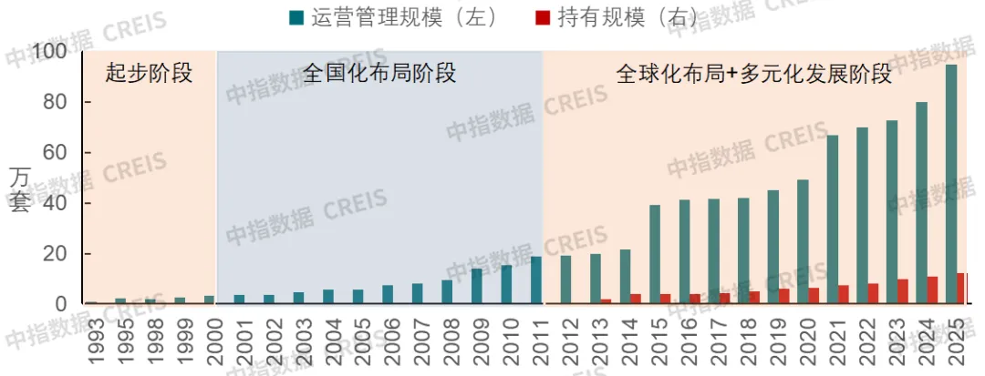 Greystar於1993年在美國創立,經歷區域起步、全國化佈局、全球化及多元化探索發展等階段後,已成長為美國規模最大的公寓運營商,業務覆蓋北美、歐洲、南美與亞太地區。從核心經營指標來看,截至2025年初,Greystar在美國管理租賃房源約94.7萬套,連續15年位居全美第一;其中自持租賃房源約12.3萬套,亦居美國租賃機構首位。業務模式上,Greystar以輕資產運營為主,自持房源在管理規模中的佔比長期保持在15%以下,形成了輕資產化拓展業務規模的發展特徵。