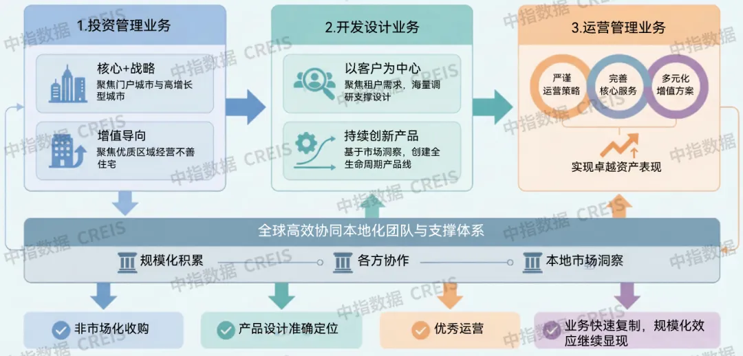 Greystar主流業務涵蓋投資管理、開發設計與運營管理三大板塊,構建了全鏈條垂直一體化的商業模式。Greystar垂直一體化商業模式的核心優勢在於全鏈條的協同效應,其中投資環節的區位與產品判斷為開發建設提供精準導向,開發階段的產品品質管控為運營管理奠定基礎,而運營過程中積累的租戶需求數據又反向優化投資與開發策略,形成了互相賦能的商業閉環。