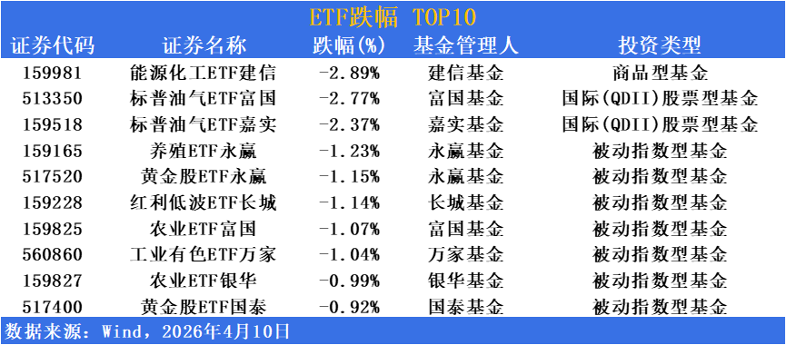 受美伊達成兩周停火協議影響,國際油價一度暴跌近20%,能源化工及油氣相關板塊遭遇獲利了結,領跌ETF市場。
