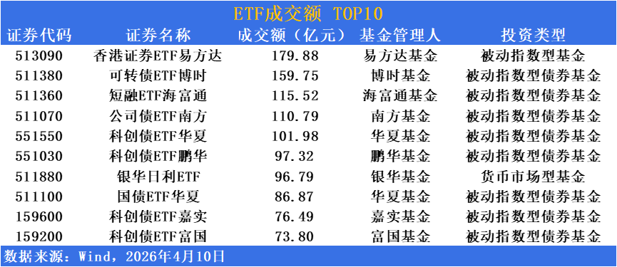 科創債ETF華夏(551550)成交101.98億元,科創債ETF鵬華(551030)成交97.32億元,科創債ETF嘉實(159600)成交76.49億元,科創債ETF富國(159200)成交73.80億元,科技創新主題債券産品交投活躍;銀華日利ETF(511880)成交96.79億元,國債ETF華夏(511100)成交86.87億元,貨幣及利率債品種保持穩健流動性。