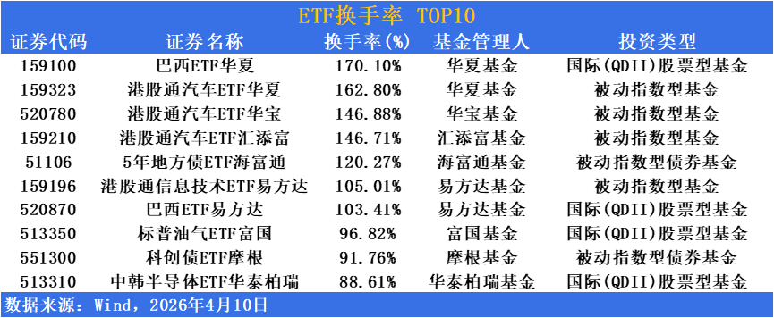 跨境QDII品種持續活躍,標普油氣ETF富國(513350)換手率96.82%,中韓半導體ETF華泰柏瑞(513310)換手率88.61%,巴西ETF易方達(520870)換手率103.41%。